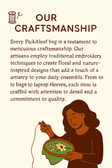 And so, I started sketching, designing, and bringing these unique ideas to lifeβbags inspired by nature, crafted with love, and embroidered with soul. What started as a personal endeavor quickly gained traction in our local community, where people were drawn to the uniqueness, craftsmanship, and the story behind each piece.